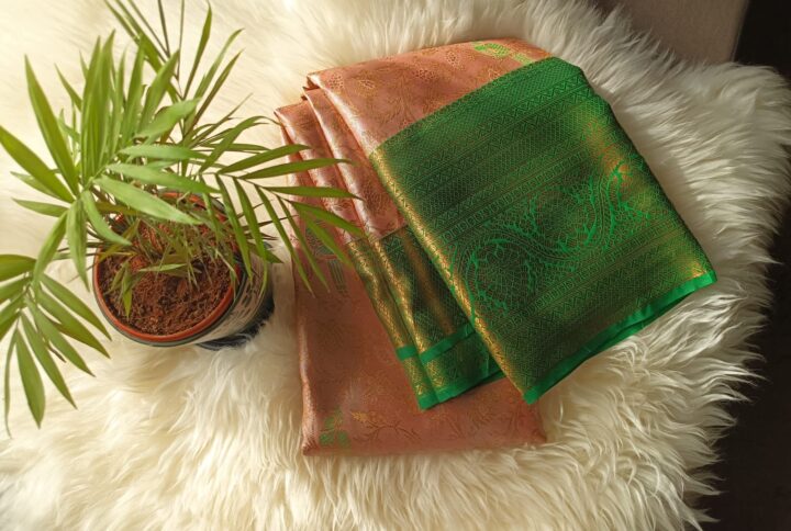 This elegant Ink Blue saree features intricate golden peacock motifs and a classic border that radiates grace and tradition. Crafted with care, its rich texture and subtle sheen make it ideal for festive occasions, weddings, or cultural celebrations. The dual golden stripes near the hem add a sophisticated finish.